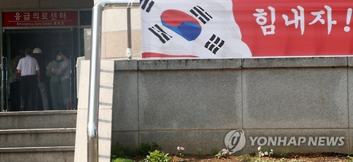 | △ 메르스 극복 "힘내자!" (평택=연합뉴스) 신영근 기자 = 보건당국이 경기도 평택굿모닝병원에서 중동호흡기증후군(메르스) 14번 환자와 관련된 3명이 메르스 확진 판정을 받았다고 밝힌 가운데 12일 오전 병원 입구에서 방문객들이 체온 검사를 받고 있다. 오른쪽에는 병원측이 평택 시민들에게 용기를 주기 내건 '힘내자! 대한민국 평택 파이팅!!' 현수막의 힘내자 글자가 보이고 있다. 2015.6.12 drops@yna.co.kr http://blog.yonhapnews.co.kr/geenang |