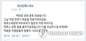 △ "백화점에 메르스 환자" SNS 거짓 유포 사과글 (인천=연합뉴스) 중동호흡기증후군(메르스)과 관련된 허위 사실을 소셜네트워크서비스(SNS)를 통해 유포한 20대 연인이 경찰에 붙잡혔다. 인천지방경찰청 사이버범죄수사대는 업무방해 및 명예훼손 혐의로 A(20·여)씨와 A씨의 남자친구 B(21)씨를 불구속 입건했다고 12일 밝혔다. 이들은 지난 5일 오후 10시 47분께 C(15)양의 페이스북을 통해 "모 백화점 직원 중에 메르스 환자 2명이 있는데 영업 중단을 하지 않기 위해 숨기고 있다"는 내용의 허위 사실을 유포한 혐의를 받고 있다. 사진은 C양이 허위 사실임을 알고 자신의 페이스북에 올린 사과글 2015.6.12 <<인천지방경찰청>> son@yna.co.kr