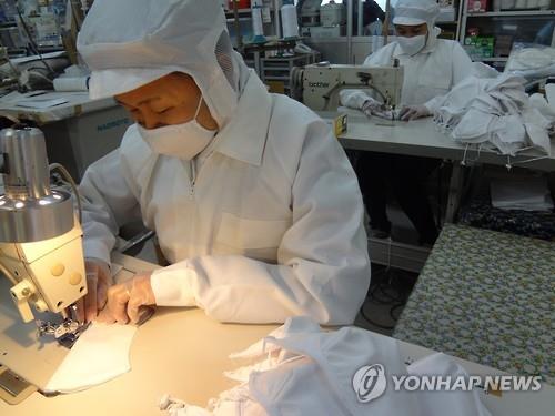 △ 일본 아이치(愛知)현 도요하시(豊橋)시에 본사를 둔 마스크 제조업체 구레바(くればぁ, Clever)의 공장에서 12일 직원들이 마스크를 제작하고 있다.(구레바 제공)