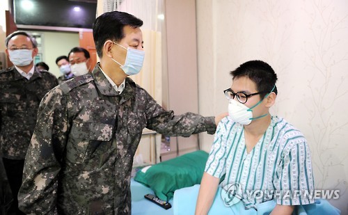 △ 국방부장관, 메르스 대비태세 현장 순시 (서울=연합뉴스) 한민구 국방부장관이 14일 오후 오산공군기지내 격리병동을 찾아 병사들을 격려하고 있다. 한 장관은 “한 발 빠르고 과감한 대응만이 메르스의 군내 확산을 차단할 수 있다면서, 현재 안정적으로 상황관리가 되고 있는 만큼 과도한 불안감은 오히려 메르스 극복에 장애가 될 수 있다”고 밝혔다. 2015.6.14 << 국방부 제공 >> photo@yna.co.kr