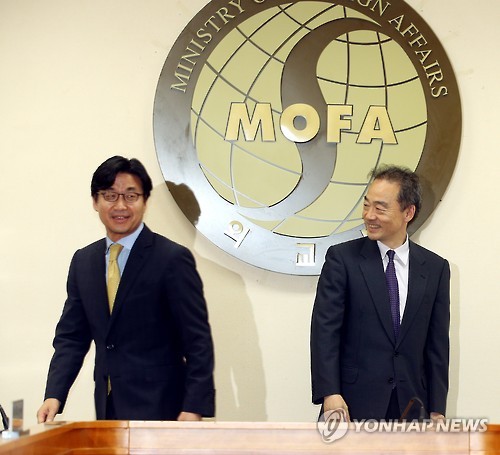 △ '각자 자리로' (서울=연합뉴스) 서명곤 기자 = 9일 오후 서울 종로구 도렴동 외교부 청사에서 최종문 유네스코 협력대표(왼쪽)가 일제 강점기 조선인 강제노동 시설이 포함된 일본 근대산업시설의 세계유산 등재 추진을 놓고 신미 준(新美潤) 외무성 국제문화교류심의관 겸 스포츠담당대사와 한일 2차 양자 협의에 앞서 악수를 한 뒤 자리로 향하고 있다. 2015.6.9 cherora@yna.co.kr