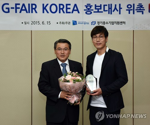 | △ G-FAIR KOREA 홍보대사에 송종국 축구해설가 (수원=연합뉴스) 15일 경기중소기업종합지원센터 윤종일 대표이사가 송종국 축구해설가를 '2015 G-FAIR KOREA 홍보대사'로 위촉한 뒤 기념촬영을 하고 있다. 2015.6.15. <<경기중소기업종합지원센터 제공>> hedgehog@yna.co.kr |