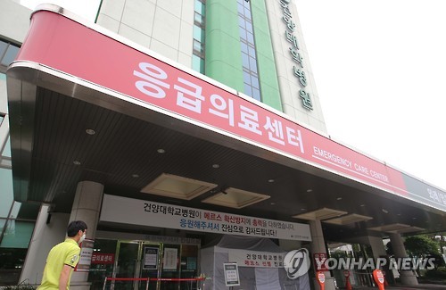 △ 진료 잠정 중단된 건양대병원 응급실 (대전=연합뉴스) 이재림 기자 = 15일 오후 대전 서구 건양대학교병원 응급실에 '진료 잠정 중단' 안내문이 붙은 채 내원객 출입이 통제되고 있다. 중동호흡기증후군(메르스) 환자 심폐소생술을 하다 메르스 확진 의료인이 발생한 병원 측은 복지부 중앙메르스관리대책본부와 협의해 응급실 진료를 일시 중단하고 중환자실과 외래는 일정 기간 신규 환자를 받지 않기로 했다.