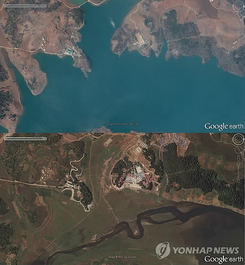 △ 극심한 가뭄으로 말라버린 북한 연풍호 (서울 구글=연합뉴스) 극심한 가뭄으로 북한 평안남도 개천시 연풍호가 메마른 모습이다. 연풍호에는 북한이 최신 시설을 갖춘 과학자 전용 휴양지로 자랑하는 연풍과학자휴양소가 있다. 구글어스 위성사진을 보면 연풍호의 2014년 4월 사진(위)은 물이 가득 차 있지만 아래 사진은 가뭄으로 물이 말라버린 모습이 확인된다.