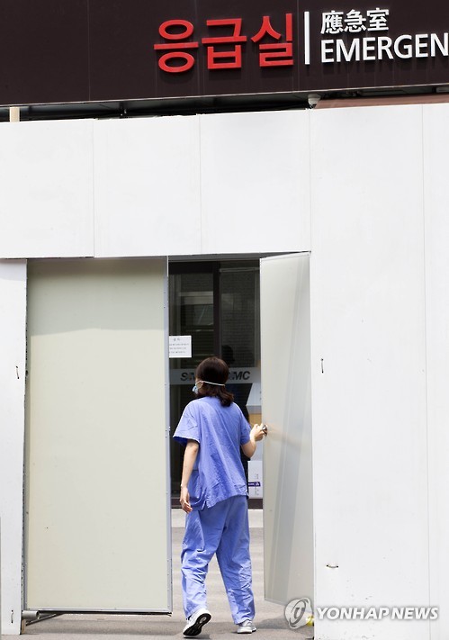 | △ '가려진 문 사이로' (서울=연합뉴스) 윤동진 기자 = 16일 중동호흡기증후군(메르스) 확산 여파로 부분적인 병원 폐쇄조치가 내려진 강남구 삼성서울병원에서 한 병원 관계자가 응급실로 들어가고 있다. 2015.6.16 mon@yna.co.kr |