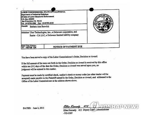 △ 캘리포니아 노동위 '버위크 대 우버' 심결 송달 (샌프란시스코=연합뉴스) 임화섭 특파원 = 미국 샌프란시스코에 본사를 둔 유사 콜택시 업체 우버를 통해 승객을 태우는 운전자를 이 회사의 피고용인으로 봐야 한다는 미국 캘리포니아 노동위원회의 심결이 나왔다. 사진은 3일자로 작성돼 4일 우버 측에 송달된 명령서 표지. 2015.6.18 solatido@yna.co.kr