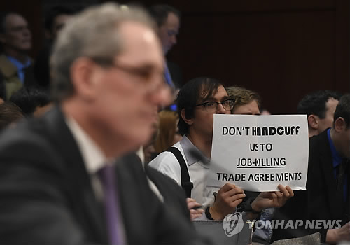 △ (AP=연합뉴스) 27일(현지시간) 미국 워싱턴의 의회 하원 세입위원회 청문회에서 마이클 프로먼 미무역대표부(USTR) 대표(왼쪽)가 환태평양경제동반자협정(TPP) 협상 등과 관련 증언하고 있다. 그 뒤에서 한 방청객이 일자리를 빼앗길 수 있다는 우려를 나타내는 문구의 종이를 들어 보이고 있다.