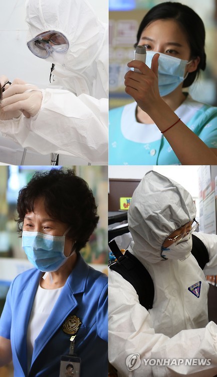 | △ 메르스와 싸우는 당신, 감사합니다 (서울=연합뉴스) 중동호흡기증후군(메르스) 여파로 대한민국이 들썩이고 있다. 메르스와의 전쟁 발생 초기부터 최전방에서 자신보다 타인을 위해 헌신하는 여러분이 있어 우리는 메르스 사태 진정이라는 희망의 끈을 놓지 않겠습니다. 오늘 하루 지친 심신을 달래며 최선을 다해주신 여러분 정말 감사합니다. 왼쪽 상단부터 시계방향으로 영등포병원 메르스 선별치료소의 의료진, 경희대학교병원 간호사, 방역업체 관계자, 미소를 잃지 않고 병원을 찾는 환자를 안내하는 경희대학교병원 김순애 수간호사.2015.6.16 photo@yna.co.kr |