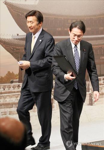 △ 제7차 한중일 외교장관회의를 마친 윤병세 외교부 장관(왼쪽), 기시다 후미오 일본 외무상이 2015년 3월 21일 서울 중구 신라호텔에서 공동기자회견을 마친 뒤 기자회견장을 나서고 있다.(사진공동취재단 = 연합뉴스 자료사진)