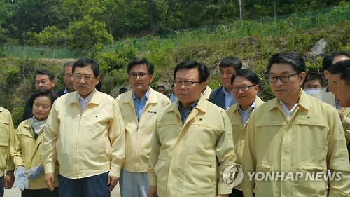 | △ 영주 방문한 이동필 농림부 장관 (영주=연합뉴스) 이강일 기자 = 18일 오전 이동필 농림축산식품부 장관이 경북 영주시 문수면 가뭄 피해 현장을 둘러보고 있다. 2015.6.18 leeki@yna.co.kr |