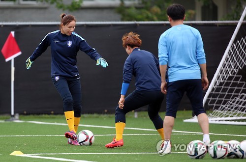 | △ 훈련하는 김정미 (몬트리올=연합뉴스) 신준희 기자 = 여자 축구 대표팀 골키퍼 김정미(왼쪽) 등 선수들이 11일 오전(한국시간) 캐나다 몬트리올 파크 생로랑에서 회복 훈련을 하고 있다. 한국 대표팀은 지난 10일 2015 캐나다 여자 월드컵 조별리그 1차전에서 브라질에 2대 0으로 패했다. 2015.6.11 hama@yna.co.kr |