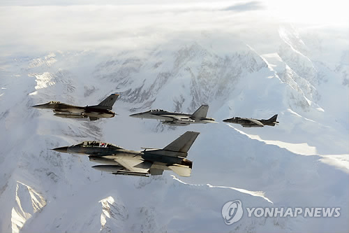 △ 공군, 레드플래그 알래스카 훈련 본격 돌입 (서울=연합뉴스) 3일(현지시간) 미국 알래스카에서 열린 레드플래그 알래스카 훈련에서 현지 적응에 나선 전투기들이 친숙화 비행을 하고 있다. 눈으로 뒤덮인 알래스카의 상공에서 우리 공군의 KF-16(맨 앞)의 조종사가 태극기를 펼쳐 보이고 있다. 그 뒤로는 왼쪽부터 미공군의 F-16CM, EA-18G 그라울러, AV-8B 해리어가 나란히 비행하고 있다. 레드플래그 알래스카 훈련은 미국 태평양공군사령부가 주관하는 다국적 연합.합동 전술 공중전투훈련으로 연 3회 시행된다. 2014.10.6 << 공군 >> photo@yna.co.kr
