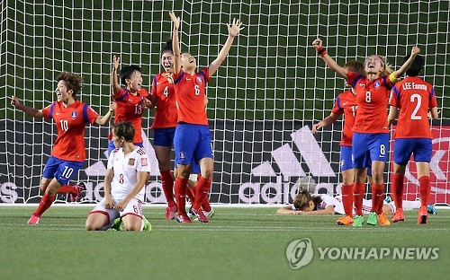 | △ '16강, 이런 맛이었어?' (오타와=연합뉴스) 신준희 기자 = 18일 오전(한국시간) 캐나다 오타와 랜스다운 경기장에서 열린 2015 캐나다 여자 월드컵 조별리그 스페인의 경기에서 한국이 2대1로 승리하며 16강 진출을 확정 지었다. 경기를 마친 한국 선수들이 환호하고 있다. hama@yna.co.kr |