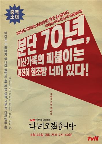 (서울=연합뉴스) 정아란 기자 = 케이블채널 tvN이 분단 70년을 맞아 이산가족을 주제로 한 4부작 다큐멘터리 '다녀오겠습니다'를 방송한다.