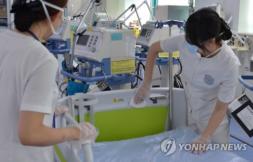 △ 을지대병원 중환자실 소독 (대전=연합뉴스) 중동호흡기증후군(메르스) 대응을 위한 격리 조처가 해제된 23일 대전 서구 을지대학교병원에서 직원이 환경 소독을 하고 있다. 2015.6.23 << 을지대학교병원 >> walden@yna.co.kr