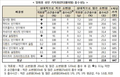 "성인용 일회용 기저귀, 제품따라 흡수력 차이 커"