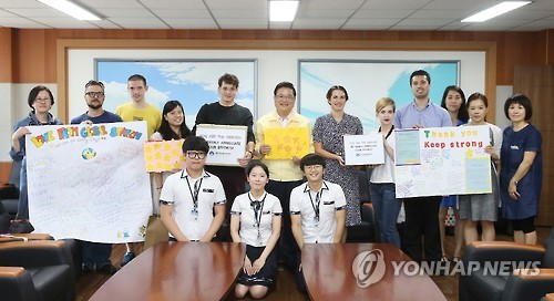 | △ "메르스 대책반 힘내세요" (대구=연합뉴스) 대구 원어민 영어보조교사와 상서고 학생들이 22일 대구시 메르스 종합대책본부를 찾아 공무원과 의료진에게 감사 편지, 직접 구운 쿠키 등을 전달했다. 2015.6.22 << 대구시교육청 >> mshan@yna.co.kr |