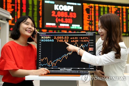 △ 코스피, 4.33포인트 오른 2,085.53으로 마감 (서울=연합뉴스) 24일 오후 서울 여의도 한국거래소 전광판에 코스피 지수가 전 거래일 대비 4.33포인트(0.21%) 오른 2,085.53으로 표시되고 있다. (한국거래소 제공)