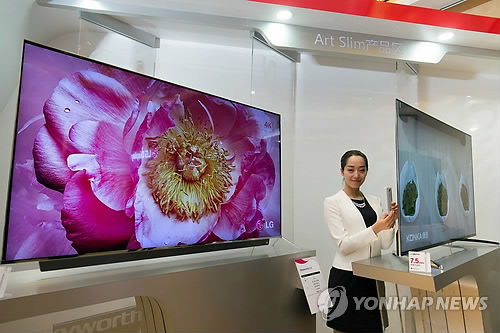 △ LG디스플레이, 베이징서 '아트슬림 프로모션' 행사 개최 (서울=연합뉴스) LG디스플레이는 지난 15일 중국 베이징에서 고객사, 유통업체, 주요 기관·협회 인사 130여명을 초청해 '아트슬림 프로모션' 행사를 열었다고 16일 밝혔다. 아트슬림은 UHD 해상도의 55인치와 65인치 제품의 두께를 스마트폰에 버금가는 7.5㎜와 8.2㎜로 구현했다. 아트슬림 프로모션 행사에서 도우미가 전시된 아트슬림 TV와 스마트폰 두께를 비교하고 있다. 2015.4.16 << LG디스플레이 제공 >> photo@yna.co.kr
