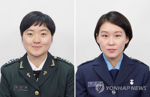 △ 최초의 여군 군종목사 (서울=연합뉴스) 26일 학생군사학교와 종합행정학교에서 거행된 학사, 단기 간부사관, 기술행정 준사관, 군종사관 등에 대한 통합임관식에서 최초의 여군 군종목사가 된 정은해 대위(왼쪽)와 남소연 중위. (육군 제공)