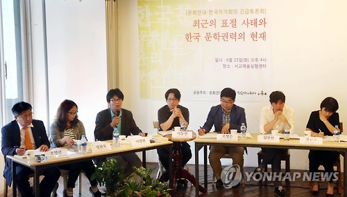 | △ 한국작가회의-문화연대, 신경숙 표절의혹 관련 토론회 개최 (서울=연합뉴스) 김수진 기자 = 23일 오후 서울 마포구 서교동 서교예술실험센터에서 한국작가회의와 문화연대가 공동 주최한 긴급 토론회가 '신경숙 작가 표절사태와 한국 문화권력의 현재'를 주제로 진행되고 있다. 사진은 조영선 민주사회를 위한 변호사모임 사무총장(왼쪽부터), 정원옥 계간 문화과학 편집위원,이명원 경희대 교수, 이동연 문화연대 집행위원장, 오창은 중앙대 교수, 시인 심보선, 정은경 원광대 교수. 2015.6.23 ksujin@yna.co.kr |
