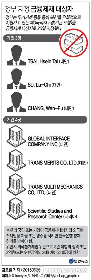 (서울=연합뉴스) 이귀원 김효정 기자 = 북한과의 무기거래 혐의로 우리 정부의 금융제재 대상에 오른 대만·시리아 국적의 개인·기관과 이들의 거래 내용이 주목된다.