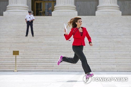 △ Eliza Shirazi of Washington, a "college associate" with Fox Business, runs to report the Supreme Court opinions outside of the Supreme Court in Washington, Thursday June 25, 2015. The Supreme Court on Thursday upheld the nationwide tax subsidies under President Barack Obama's health care overhaul, in a ruling that preserves health insurance for millions of Americans. The justices said in a 6-3 ruling that the subsidies that 8.7 million people currently receive to make insurance affordable do not depend on where they live, under the 2010 health care law. (AP Photo/Jacquelyn Martin)