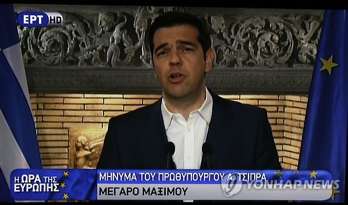 | △ 알렉시스 치프라스 그리스 총리는 27일 TV 중계 긴급 연설을 통해 국제 채권단이 제시한 구제금융 및 경제개혁 방안에 대한 찬반 국민투표를 내달 5일 실시하겠다고 발표했다. (AP=연합뉴스) |