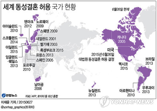 (워싱턴·샌프란시스코·댈러스=연합뉴스) 심인성 임화섭 장현구 특파원 = 미국 연방대법원이 동성결혼 합헌 결정을 내리고 미국 전역에 동성결혼 허용한 26일(현지시간) 미국 전역은 성적 소수자의 권리 보장을 지지하는 무지개색 물결로 뒤덮였다.