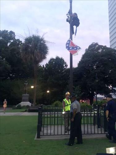 △ 미국의 흑인 여성활동가 브리 뉴섬이 27일(현지시간) 오전 사우스캐롤라이나 주 의사당 앞마당의 깃대에 올라가 남부기를 들고 내려오고 있다.
