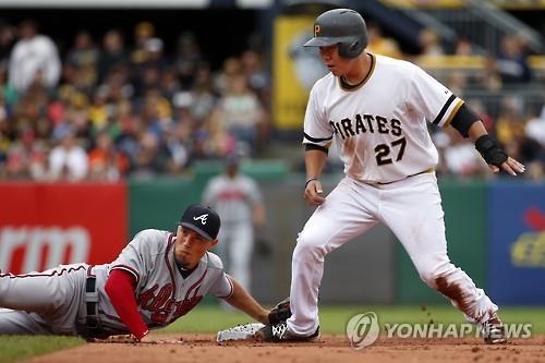 강정호는 28일(현지시간) 미국 펜실베이니아 주 피츠버그의 PNC 파크에서 열린 미국프로야구 애틀랜타 브레이브스와의 홈경기에서 2번 타자 3루수로 출전해 2타수 무안타, 몸에 맞은 공 1개로 경기를 마쳤다.