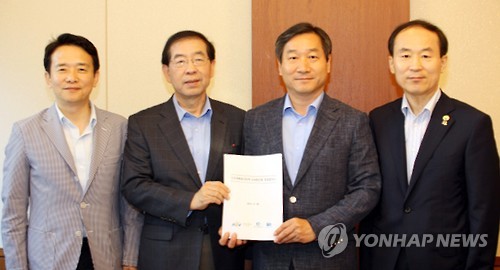 | △ 수도권매립지 4자 협의체 최종 합의 (인천=연합뉴스) 유정복 인천시장은 28일 시청사에서 기자회견을 열고 2016년 말 사용 종료하기로 한 수도권매립지를 약 10년간 더 사용하기로 서울·경기·인천이 합의했다고 밝혔다. 사진은 이날 서울 더케이호텔에서 열린 수도권매립지 4자 협의체 회의에서 남경필 경기도지사(왼쪽부터), 박원순 서울시장, 유정복 인천시장, 윤성규 환경부장관이 합의문에 서명한 뒤 기념촬영하는 모습. 2015.6.28 << 인천시청 제공 >> tomatoyoon@yna.co.kr |