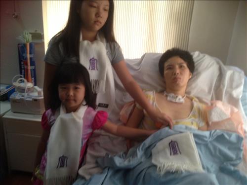 | △ 필리핀 대사관과 보성 선씨 종친 등의 후원으로 28일 오후 필리핀에서 반혼수 상태로 입국한 선민정 씨. 큰딸 희원, 둘째 딸 희수가 엄마의 손을 붙잡고 있다. 현재 선 씨는 대전 중구에 있는 선병원에서 입원 치료 중이다. |