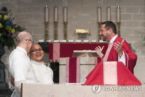 △ 미국 텍사스 주 댈러스의 한 성당의 사제가 28일(현지시간)동성커플의 결혼식을 주재하고 있다.(AP=연합뉴스)