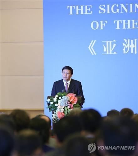 △ 이준삼 특파원 = 러우지웨이(樓繼偉) 중국 재정부장(장관)이 29일 오전(현지시간) 중국 베이징(北京) 인민대회당에서 열린 아시아인프라투자은행(AIIB) 협정문 서명식에서 기조연설을 하고 있다.