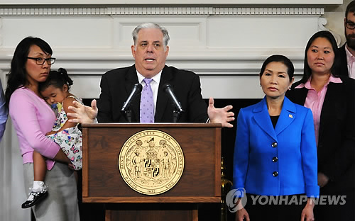 △ '한국사위' 미 메릴랜드 주지사 "암 투병" (애나폴리스 AP/볼티모어 선=연합뉴스) '한국 사위' 래리 호건(59) 미국 메릴랜드 주지사가 지난 22일(현지시간) 자신의 림프종암 투병 사실을 공개하고 있다. 호건 주지사는 이날 주도인 애나폴리스 주지사 관저에서 긴급 기자회견을 통해 "상당히 진행되고 매우 공격적인 비 호지킨림프종(non-Hodgkin Lymphoma)암 3기 진단을 받았다"며 "곧 항암화학요법 치료를 시작할 것"이라고 덧붙였다. 부인 유미(왼쪽) 여사 등 그의 가족들이 배석해 있다.