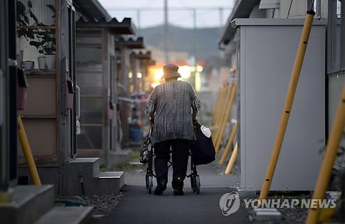 △ 2014년 9월 일본 미야기 현의 한 가설주택 단지에서 걸어가는 노인의 모습. (교도=연합뉴스 자료사진)