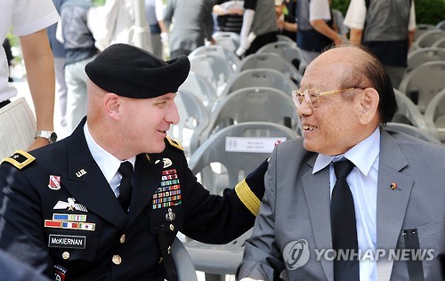 △ "65년전 180명의 희생이 오늘날 번영에 밑거름" (오산=연합뉴스) 김경태 기자 = 2일 경기도 오산 유엔군초전기념비 앞에서 열린 제65주년 유엔군 초전기념 및 스미스부대 전몰장병 추도식에서 한국전쟁 당시 유엔군 첫 전투였던 오산 죽미령 전투에 한국군인으로 유일하게 참전했던 윤승국 예비역 소장(당시 대위)이 브라이언 맥키넌 미 8군 부사령관과 대화를 나누고 있다. 2015.7.2 ktkim@yna.co.kr