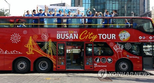 △ (부산=연합뉴스) 서병수 부사시장을 비롯한 지역관광업계 인사 등 100여 명으로 구성된 부산관광 홍보단이 2일 지붕이 없는 2층 부산시티투어버스를 타고 서울 시내 일대에서 '올 여름엔 부산 가자'란 주제로 대규모 부산관광 로드쇼를 펼치고 있다. 이들은 할인 쿠폰북과 부산관광 홍보물을 나눠주며 수도권 관광객을 부산으로 유치하는 활동을 벌였다. 2015.7.2 << 부산관광공사 >> ccho@yna.co.kr