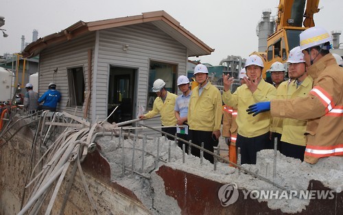 | △ 사고 현장 방문한 이기권 노동부장관과 김기현 울산시장 (울산=연합뉴스) 이상현 기자 = 3일 한화케미칼 폭발 사고 현장에 이기권 고용노동부장관(오른쪽에서 두번째)과 김기현 울산시장(오른쪽에서 세번째)이 방문해 사고 상황을 살펴보고 있다. 2015.7.3 leeyoo@yna.co.kr |