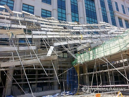 | △ 천안 공사현장서 근로자 추락 7명 사상 (천안=연합뉴스) 한종구 기자 = 4일 오전 11시 6분께 충남 천안시 동남구 안서동 백석문화대 외식산업관 신축 공사현장 층 높이에서 근로자 7명이 추락하는 사고가 발생했다. jkhan@yna.co.kr |