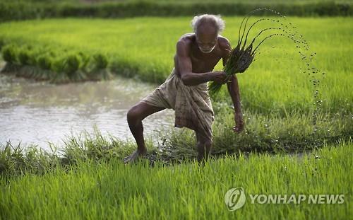 △ 3일(현지시간) 인도 북동부 아삼 주 레바 마헤스와르 마을에서 한 농부가 일하고 있다.(AP=연합뉴스)