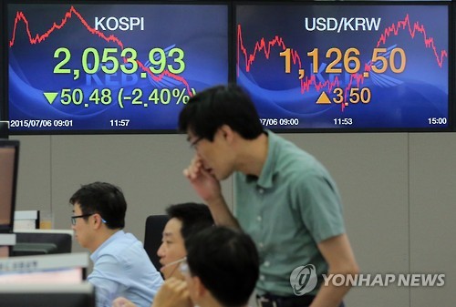 △ 코스피 3년만에 최대 하락 (서울=연합뉴스) 이정훈 기자 = 그리스 국민투표에서 채권단의 긴축안에 대해 압도적인 반대표가 나오면서 향후 사태 전개가 안갯속에 빠져들자 국내 증시가 6일 폭락세를 보였다. 이날 코스피 하락률은 2012년 6월 4일(51.38포인트, 2.80% 하락) 이후 가장 컸다. 코스피는 전 거래일보다 50.48포인트(2.40%) 내린 2,053.93, 원/달러 환율은 전 거래일보다 3.5원 오른 1,126.5원에 거래를 마쳤다. 사진은 이날 서울 중구 명동 외환은행 본점 딜링룸.