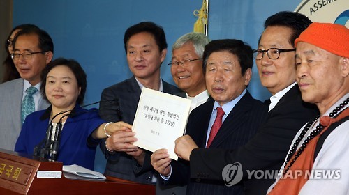 △ 사형제도 폐지 법안 든 의원들과 종교인들 (서울=연합뉴스) 도광환 기자 = 새정치민주연합 유인태의원을 대표로 여야의원들과 종교인들이 6일 오전 국회 정론관에서 사형제도 폐지 특별법안을 국회 의안과에 제출하기에 앞서 법안을 들고 포즈를 취하고 있다.