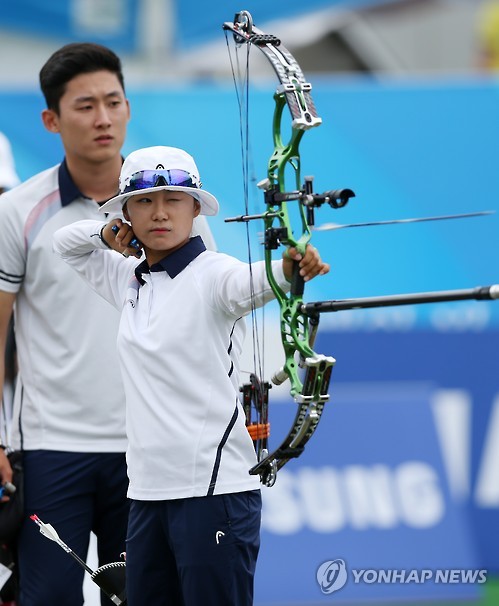 | △ <U대회> 송윤수의 금빛 화살 (광주=연합뉴스) 윤동진 기자 = 양궁 대표팀 송윤수가 7일 오후 광주 서구 광주국제양궁장에서 열린 2015 광주하계유니버시아드 양궁 컴파운드 혼성 결승전에서 활을 쏘고 있다. 2015.7.7 mon@yna.co.kr |