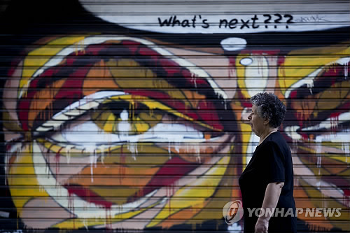 | △ 다음은 무엇? (아테네 AP=연합뉴스) 7일(현지시각) 아테네 거리에 "다음은 무엇?"이라고 쓰인 그라피티 옆을 한 여성이 지나가고 있다. 알렉시스 치프라스 그리스 총리는 이날 유로존 지도자들과 긴급 협의를 위해 브뤼셀로 출발했다. |
