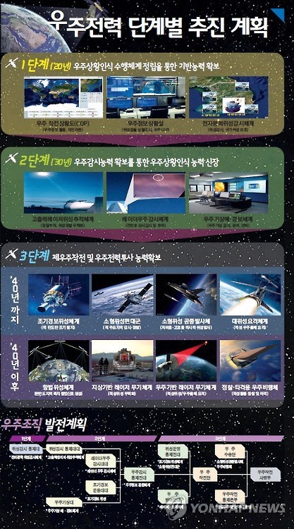 마지막 3단계인 2040년을 전후로 적 위성을 무력화시키기 위한 지상·우주기반 방어체계와 다양한 발사체를 개발하고, 유·무인 우주비행체를 운영하는 등 우주작전 및 우주전력 투사 능력을 확보해 나갈 계획이다.