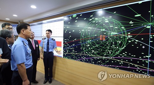 | △ 우주정보 상황실 개관 (계룡=연합뉴스) 양영석 기자 = 공군이 8일 충남 계룡대에 있는 공군연구단 건물에 우주정보상황실을 개관했다. 이날 개관식을 찾은 최차규 참모총장과 국내 우주 관련 기관 관계자들이 상황실 시설과 운영 시스템에 대해 설명듣고 있다. 2015.7.8 youngs@yna.co.kr |