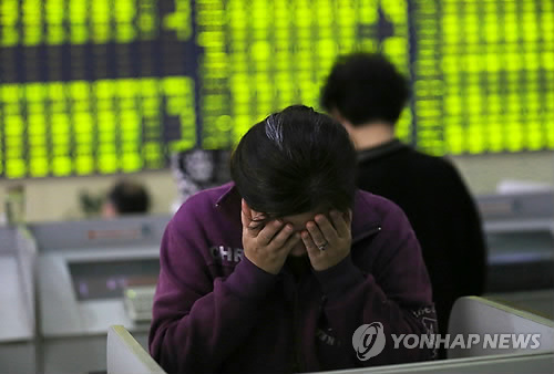 | △ 주식 전광판 쳐다볼 수가 없구나 (난퉁<중국> AP=연합뉴스) 8일 중국 장쑤성 난퉁의 주식거래소에서 한 여성이 전광판을 뒤로 한 채 돌아서서 얼굴을 감싸고 있다. 이날 상하이 종합지수는 5.9% 하락했다. |