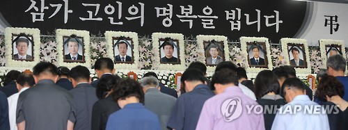 △ "삼가 고인의 명복을 빕니다" (완주=연합뉴스) 김동철 기자 = 중국 연수 중 버스 추락사고를 당해 귀국한 공무원들이 9일 오전 전북 완주군 지방행정연수원에 복귀한 뒤 분향소를 찾아 고인들의 넋을 위로하고 있다. 2015.7.9 sollenso@yna.co.kr